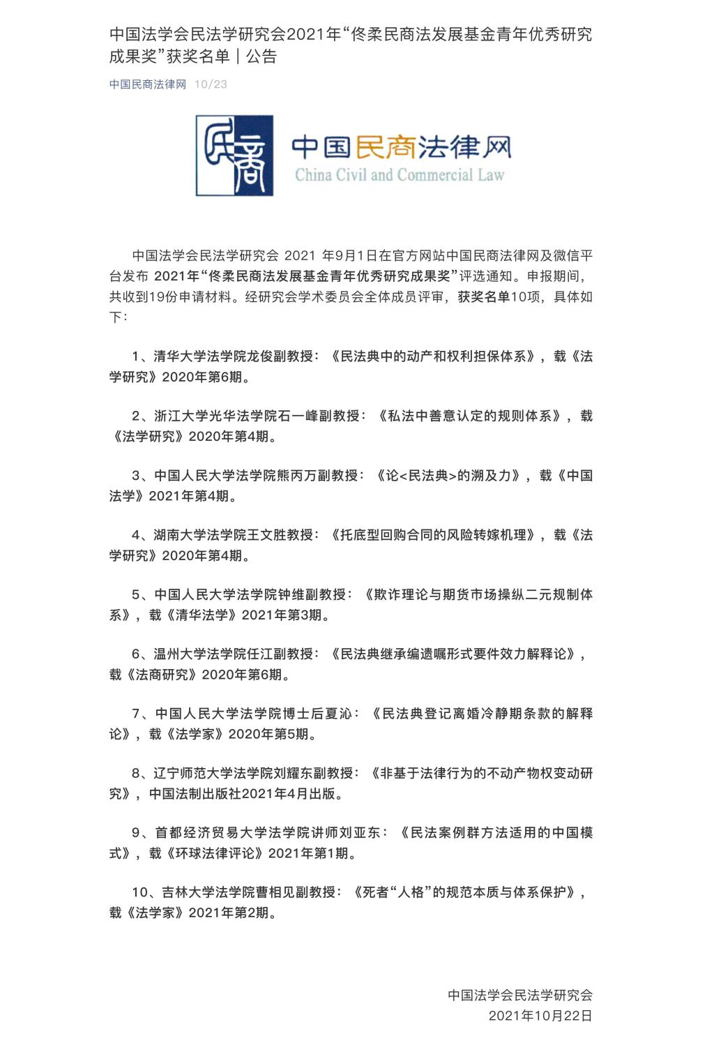 2021年10月22日,中国法学会民法学研究会在官方网站中国民商法律网及微信公众号公布了2021年“佟柔民商法发展基金青年优秀研究成果奖”获奖名单,棋牌游戏官网
