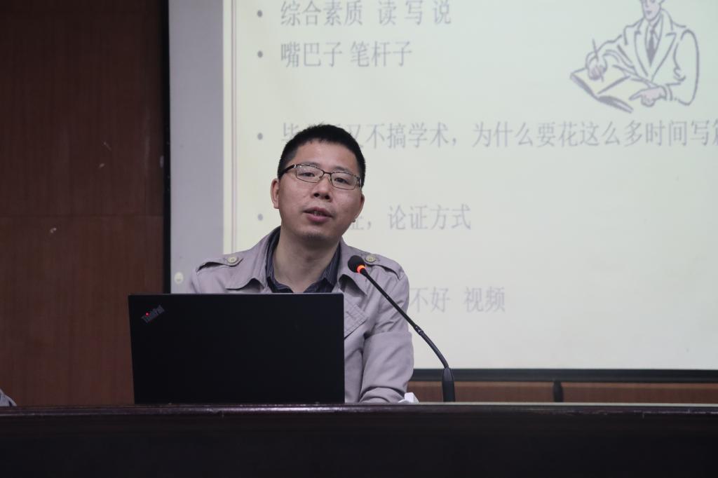 讲座主题为《学术论文写作纵横谈》,蒋老师从写作意义、学术论文概念、论文选题、摘要写作、关键词选取、论文结构、其他问题等几个方面展开详细讲解。他例举了大量写作实例,轻松诙谐,娓娓道来,与同学们畅谈论文写作的技巧与方法。