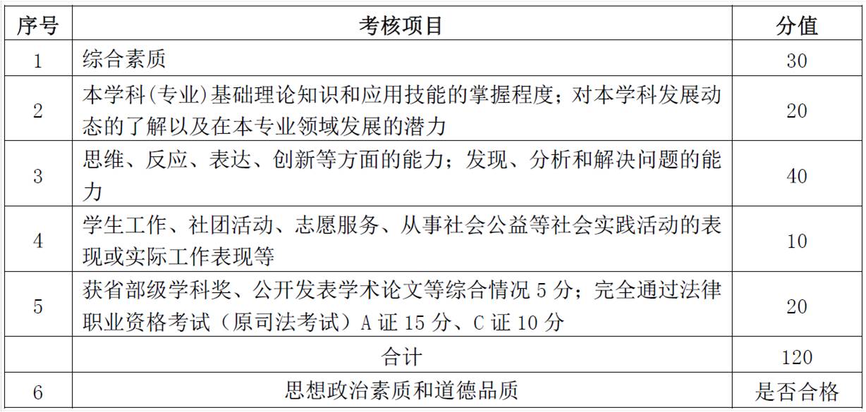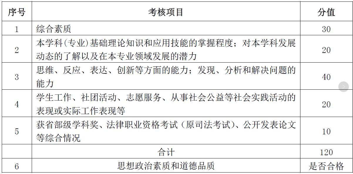 主要考察考生的思维、反应、表达、创新等方面的能力;综合素质、从事社会公益、思想政治素质及道德品质等方面的情况,共120 分。其中思想政治素质和道德品质主要考核考生的现实表现,内容包括考生的政治态度、思想表现、道德品质、遵纪守法、诚实守信等,其考核结果不计入考生总成绩,但考核不合格者,将不予录取。