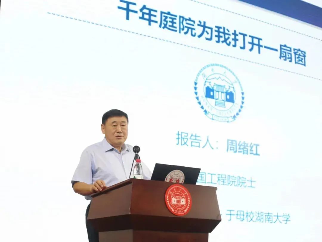 周绪红院士首先以岳麓书院的对联向同学们讲述书院精神。“合安利勉而为学,通天地人之谓才”,周院士强调“勉”、“励”二字,激励同学们将读书与治学融入人生,奋发自强、努力成才。“惟楚有才,于斯为盛”,岳麓书院人才辈出,传递湖湘文化,2020年习近平总书记在湖南大学考察时提出,新时代是一个英雄辈出的时代,青年人正逢其时。周院士以百年来岳麓书院精神的传承鼓励同学们,学习传统文化中的精华并发扬光大,不仅要读书明理,还要承担社会责任、坚守家国情怀,成为具有科学精神与创新能力的人才。