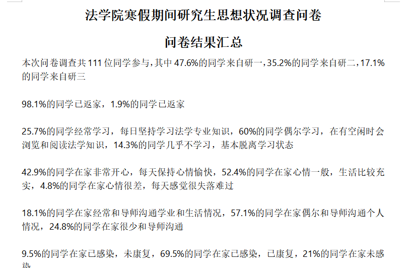 研究生寒假期间正常学习生活,调研部设计并发布了思想状况调查问卷,并对调查结果分析汇总,充分保障研究生的各项权益。