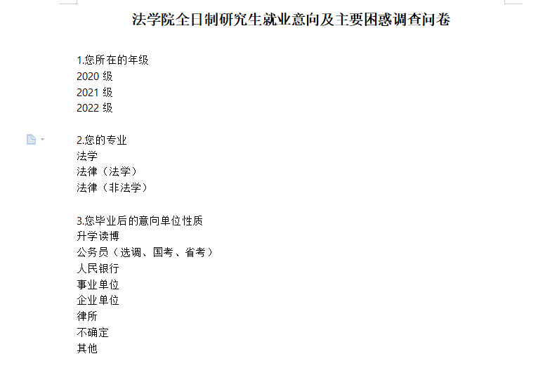 的学习生活适应性情况,调研部在开学后设计并发布了针对2022级新生的调研问卷。通过调研问卷,了解同学们对于校园环境、生活服务、课程安排、学习压力等情况,有针对性提出解决方案,做好校园新生入学生活的过渡性指导。为了解学生对就业求职的需求,调研部设计并发布了针对律所招聘的调研问卷。通过调研问卷,了解同学们对于实习、求职目标、理想律所、理想业务等的要求,更好的与用人单位进行沟通。