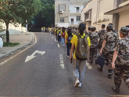 同学们排好了整齐的方阵,在篮球场前准时集合。人数清点完毕后,新同学们排着长队有序地向训练场进发。一排排长队如同一条条蜿蜒的长龙,展现着活力与蓬勃的朝气。