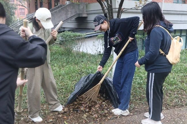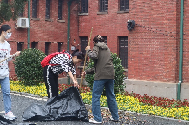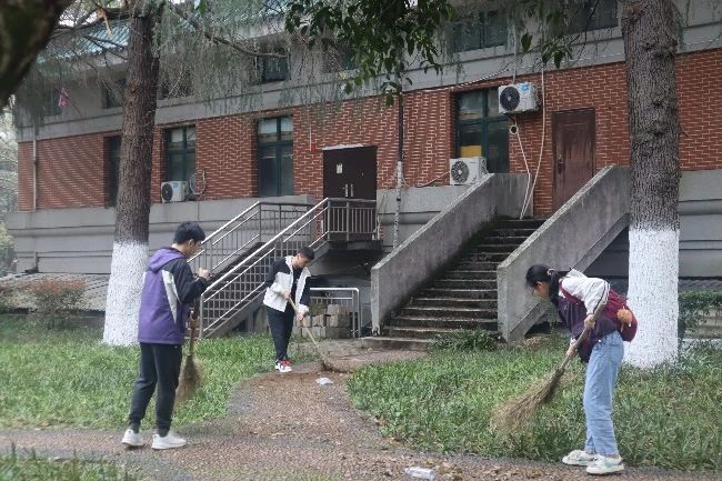此次志愿清扫活动共分为六组,由团委办公室的六名成员分别带队。领取完清扫工具后,在环卫工人叔叔的耐心指导下,本次志愿清扫活动有序展开。活动中,志愿者们将草坪中的落叶、枯枝、烟头和塑料垃圾一并扫出,集合成堆,再合作将其收入黑色垃圾袋。