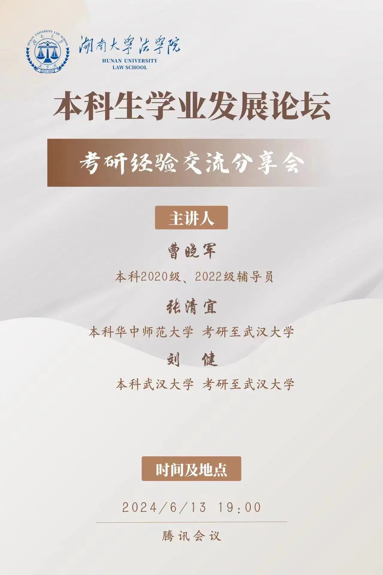 法棋牌游戏官网 学习部学习部邀请了20级、22级辅导员曹晓军老师,本科华中师范大学、考研至武汉大学的张清宜学姐,本科武汉大学、考研至武汉大学的刘健学长为大家分享关于考研的情况和经验,欢迎同学们积极参加!