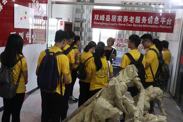 参观完天青社区居委会后,实践团来到社区会议室,与永丰镇和社区骨干交流座谈。在被问及天青社区如何开展扶贫工作时,胡书记介绍道:“天青社区将扶贫工作与社区服务相结合,通过创立阳光家政服务公司,为本社区的待业人员提供岗位;设立残疾人辅助性就业基地,组织残疾人制作手工艺品,为其提供收入。这一系列举措不但能够基本保障残疾人的日常生活,还能让他们通过自身的劳动实现自己的价值。同时,我们非常重视残疾人等弱势群体的身心健康,设立了心理健康咨询室,定期组织义工开展咨询服务工作。”永丰镇党委委员重点回答了养老服务方面的问题,指出天青社区的养老服务工作在全县走在前列,尤其是居家养老网络信息平台呼叫中心解决了困扰老年人的日常生活问题,让服务进家。“天青社区在倡导以居家托养替代集中照管的新型养老服务模式以外,还建立了老年人日间照料中心,为老年人、残疾人等弱势群体提供交流学习、娱乐健身的休闲活动场所。自从活动中心建成以后,这里就成了老年朋友的家园,很多社区居民都喜欢到活动室开展娱乐活动,到社区书屋读书看报,社区周到的服务和免费的绿色餐饮受到老年朋友的一致好评。”胡书记就同学们在社区服务方面的问题进行了解答。