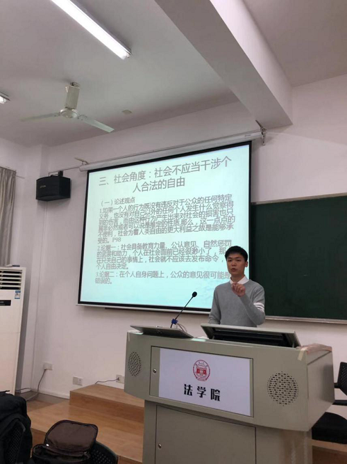 303教室顺利开展。活动邀请了蒋海松老师作为指导老师,主题发言人分别是法学硕士生杜昌恩、刘丽娜,主评议人分别是湖大法学硕士曹孝前和湖南师范大学博士生卢明涛。本期读书会的主题是《论自由》第四章“论社会驾于个人的权威的限度”和第五章“本书教义的应用”。