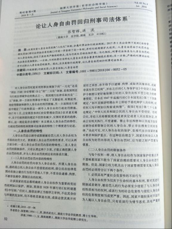 洪流同学系棋牌游戏官网 2015级博士研究生,专业方向为刑事法学,已发表CSSCI期刊论文多篇。其中在《湘潭大学学报》与导师张智辉教授合作发表论文《论让人身自由罚回归刑事司法体系》。