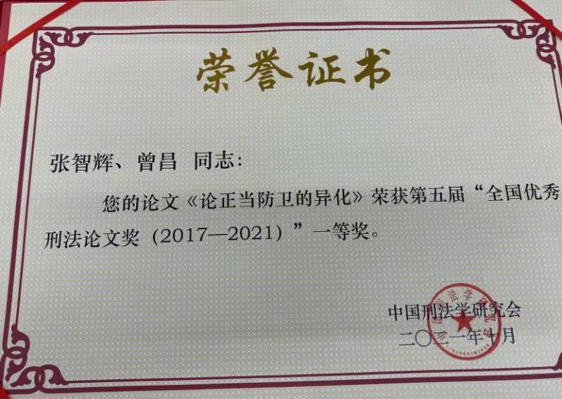 张智辉教授、曾昌博士研究生合著《论正当防卫的异化》一文被评为第五届全国优秀刑法论文奖(2017-2021)一等奖,棋牌游戏官网