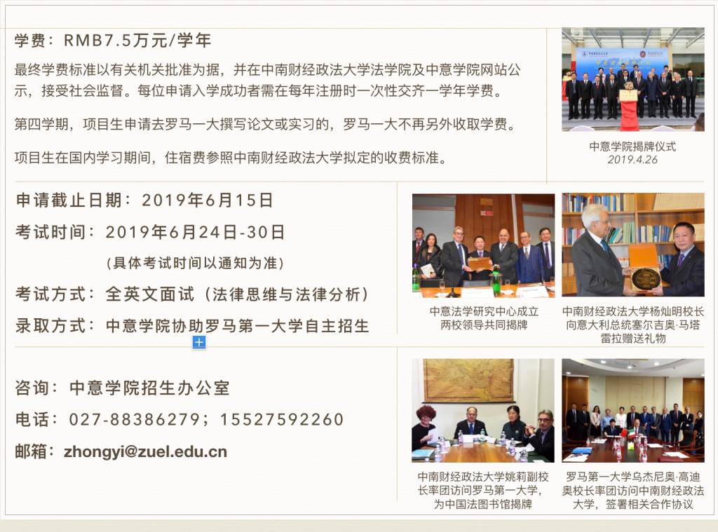 “欧洲学:比较法与欧洲法”硕士学位教育项目,由中南财经政法大学与意大利罗马第一大学合作举办,并经中华人民共和国教育部批准设立(许可证编号:MOE42IT1A20181945N)。中南财经政法大学通过引进意大利罗马第一大学先进的办学经验和教育理念,按照国际化人才培养标准,用全英文教授“欧洲学:比较法与欧洲法”课程,致力于培养一批具有国际视野、通晓国际规则,能够维护国家利益和参与国际法律事务的应用型、复合型的涉外人才。