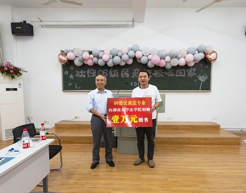 分享完毕后,大家起身向老师鞠躬致敬,感谢老师培育之恩。为表达校友对母校的赤子之情,06级民商法校友们集体为母校捐赠一万元图书,为母校法学教育发展贡献力量,屈茂辉院长代表法棋牌游戏官网