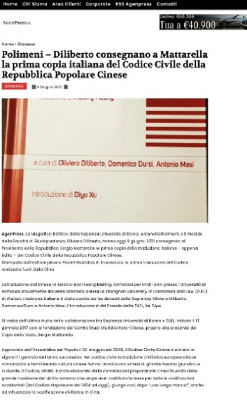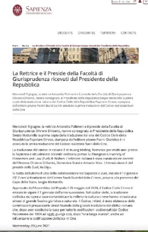 多家意大利媒体对此进行了报道,“这是中国民法典的第一个意大利语译本,由意大利前司法部长奥利维耶罗·迪利贝尔托组织,是中意文化交流的合作典范,是罗马第一大学和中南财经政法大学的最新合作成果,也是两国践行一带一路倡议的重要智识支撑。”
