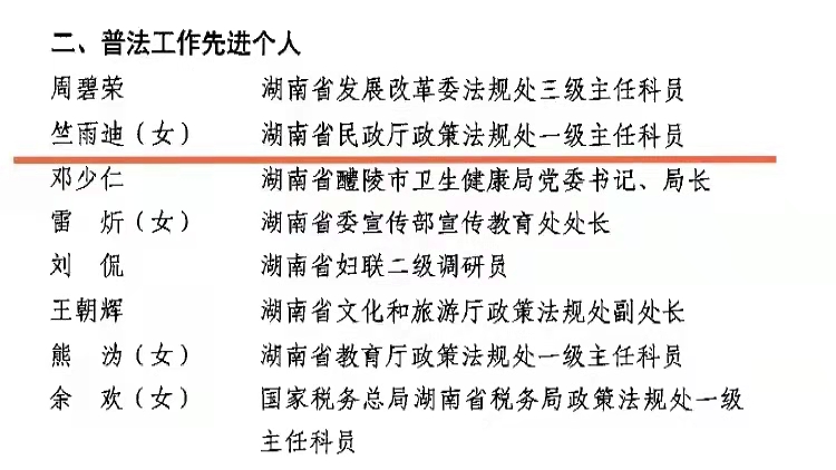 众多优秀教师的悉心培养和指导,为今后从事政府法制工作打下了坚实的基础。2011年毕业后,先后在税务、民政部门工作。现任湖南省民政厅政策法规处一级主任科员、厅机关公职律师、省侨联第四届法顾委委员,多次被评为公务员考核“优秀”、“优秀共产党员”、“优秀党务工作者”等。其所在单位湖南省民政厅多次获省“法治政府建设优秀单位”“行政执法优秀单位”“谁执法谁普法优秀单位”等称号,被评为全省“六五”普法先进单位、全省第一批“法治政府建设示范单位”。