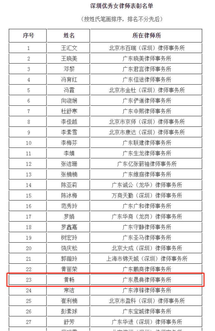 为进一步提高深圳女律师业务水平和职业道德素养,树立女律师专业敬业、坚韧自信、勇于担当的良好社会形象,激励女律师不断精进、自强不息、奋发进取,充分发挥先进典型的示范引领作用,深圳市律师行业党委、深圳市律师协会决定,对专业能力、公益爱心、创新成长等方面表现突出的黄畅等30名女律师授予“深圳优秀女律师”荣誉称号。