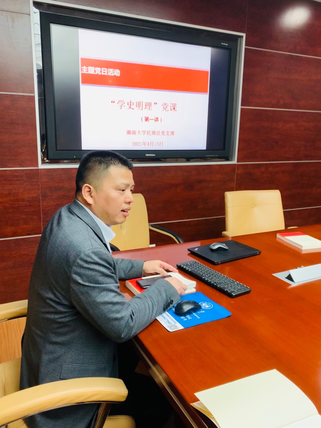 2021413日下午,湖南大学民商法党支部集聚法学楼405,党支部书记张红同志宣讲“学史明理”党课第一课,支部成员认真学习领会党课精神。
