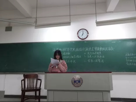 会议伊始,同学们饱含热情与崇敬唱响团歌,充分调动会议气氛。团支书赵玲羽首先上台,从重大意义、丰富内涵、核心要义、实践要求四方面汇报了自己的学习心得和感悟。同时,她希望同学们将党的精神自觉牢记于心中、坚决落实到行动上。随后,她向全体同学公示了班级团支部组织生活会的筹备情况,以便同学们更好地了解本次组织生活会举办的目的和意义。
