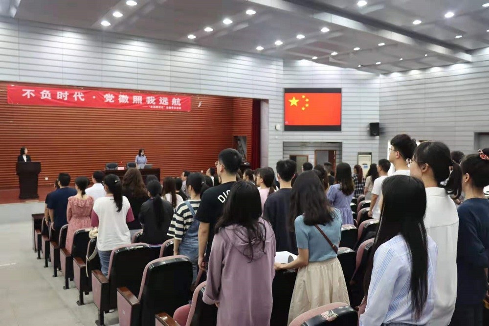 2021届毕业生党员 “不负时代.,党徽照我远航”主题党日活动暨毕业生党员党组织关系转接培训在法学楼报告厅拉开序幕。活动由党务干事成凤仪老师主持,副处级组织员马启明、党务与学生工作办公室主任刘岳峰及所有2021届毕业生党员参加了活动。