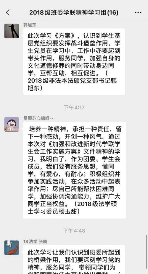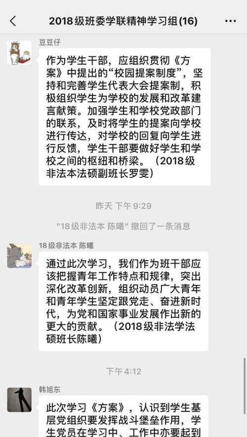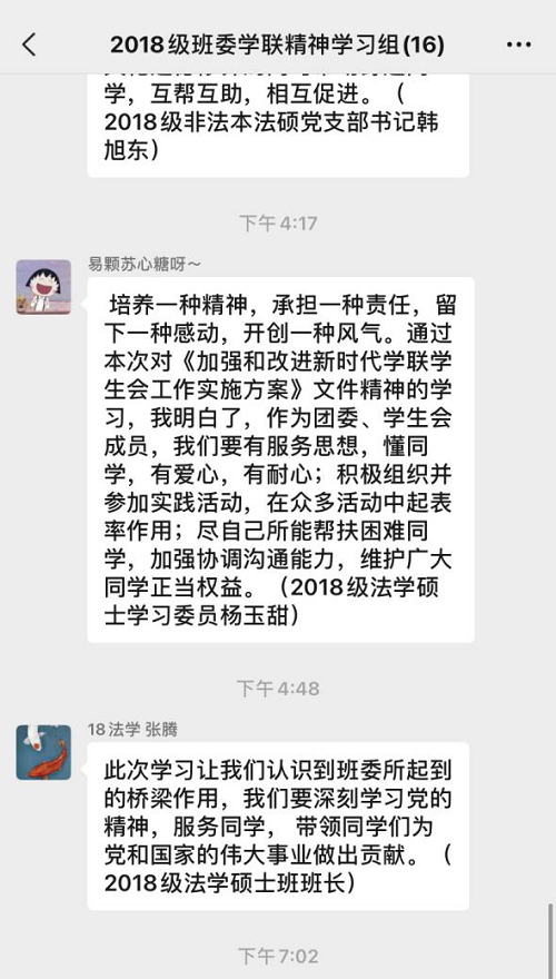 在此次交流中,普遍认为作为学生干部应该始终抱着一颗为同学们服务的心,而不是认为自己是干部而形成一种优越感。另外要加强主题教育,我个人认为参观红色教育基地是一个很好的形式。在学习了相关红色历史同时又不会觉得枯燥。对于在交流中提及到的在群内发通知,反复强调仍然会少数同学不看或者忽略的情况。一方面私聊是一个目前比较简便的方式来提醒没有及时看到消息的同学,另一方面有的同学提出的奖励机制我也觉得不错。因为毕竟研究生不像本科生,可能有很多其他的事情要忙,因此对于积极回复的同学予以奖励,从而带动大家的积极性。总之,此次的交流虽然比较短暂,但是大家畅所欲言,针对相关的问题提出自己的见解,收获不少。