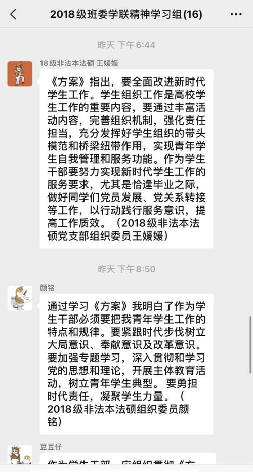 20级硕士研究生班委在院研究生会的组织下针对中央办公厅关于学生工作的最新文件进行了集中学习。针对文件信息和传达的精神,我们就学生干部的自身素质提高和自律性加强进行了着重讨论,对学生干部如何“去官僚化”,“去行政化”,并就如何与同学们进一步加强联系和更好地开展工作等达成了一致意见。另外,在如何进一步丰富学生活动,加强对外交流等方面也一一进行了讨论,会上,各班级干部踊跃发言,在其中,本人也学习到了许多管理班级的经验,收获颇丰。