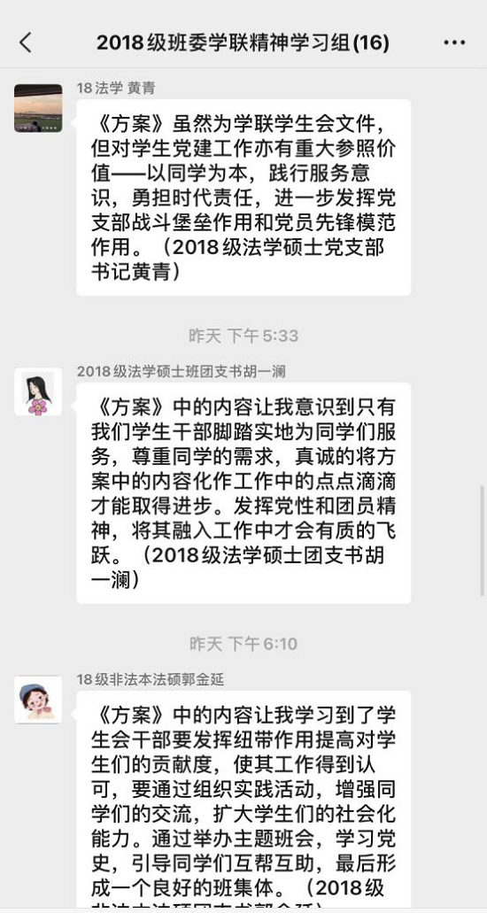 通过深入学习《加强和改进新时代学联学生会工作实施方案》,对习近平总书记关于青年工作的重要思想和关于教育的重要论述有了进一步的了解和认识,我明白了党支部活动的开展不能脱离青年学生活动的特点和规律,要着力服务于广大同学的普遍性需求,要不断提升同学满意度、大局贡献度和社会认可度。因此,在日后的党支部活动中,法本法硕班将紧紧围绕这三个要求,在丰富活动载体的同时寓教于乐,使得党员同志深入学习贯彻习近平新时代中国特色社会主义思想,学习党史、新中国史、改革开放史、社会主义发展史,将爱国爱党和爱社会主义高度统一。
