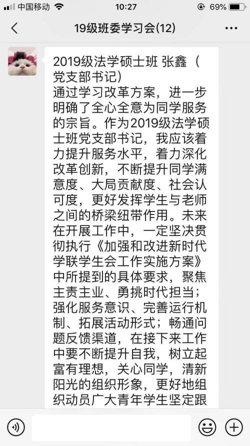 通过学习改革方案,进一步明确了全心全意为同学服务的宗旨。作为2019级法学硕士班党支部书记,我应该着力提升服务水平,着力深化改革创新,不断提升同学满意度、大局贡献度、社会认可度,更好发挥学生与老师之间的桥梁纽带作用。未来在开展工作中,一定坚决贯彻执行《加强和改进新时代学联学生会工作实施方案》中所提到的具体要求,聚焦主责主业、勇挑时代担当;强化服务意识、完善运行机制、拓展活动形式;畅通问题反馈渠道,在接下来工作中要不断提升自我,树立起富有理想,关心同学,清新阳光的组织形象,更好地组织动员广大青年学生坚定跟党走,奋进新时代,为党和国家作出贡献。