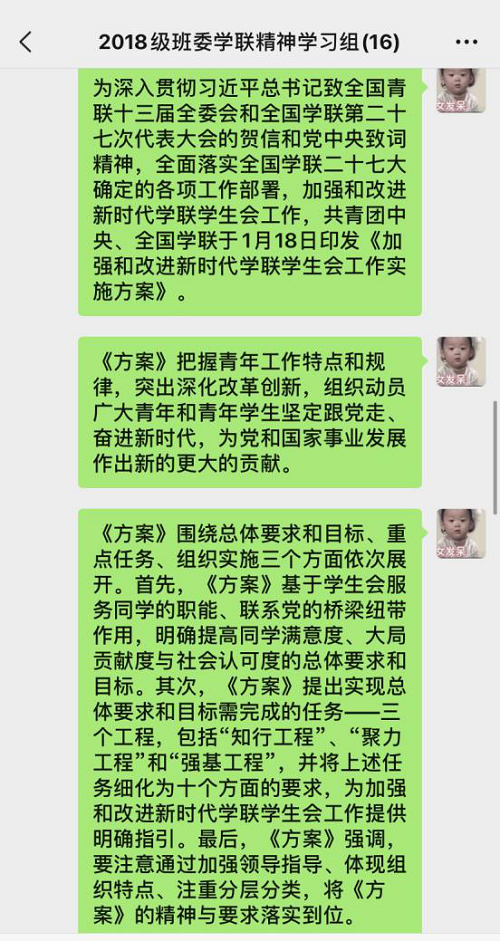 近日院研会组织全体成员学习《加强和改进新时代学联学生会工作》实施方案,通过这次学习,我受益很大。学联学生会以全心全意为同学服务为宗旨,着力服务广大青年学生,我们应该贯彻落实此方案,做好党联系青年学生的桥梁和纽带,提高同学对学联学生会的满意度,我们也应利用好自己的专业优势,把所学知识运用进学生会,做出自己的贡献。接下来,我们要不忘初心,全心全意为同学服务,动员青年学生跟党走,把学联学生会建设得更好,为党和国家事业做出新的贡献!