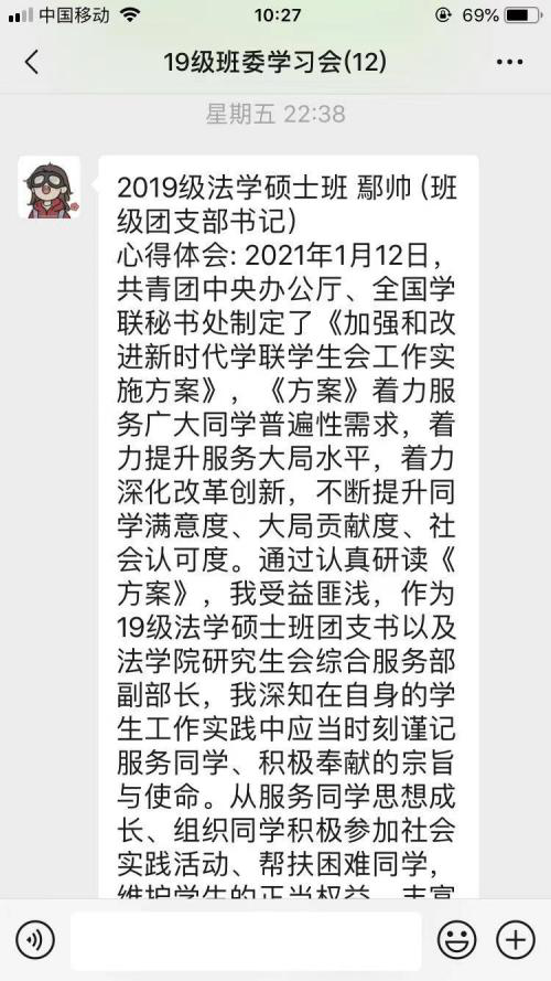 2021年1月12日,共青团中央办公厅、全国学联秘书处制定了《加强和改进新时代学联学生会工作实施方案》,《方案》着力服务广大同学普遍性需求,着力提升服务大局水平,着力深化改革创新,不断提升同学满意度、大局贡献度、社会认可度。通过认真研读《方案》,我受益匪浅,作为19级法学硕士班团支书以及法棋牌游戏官网