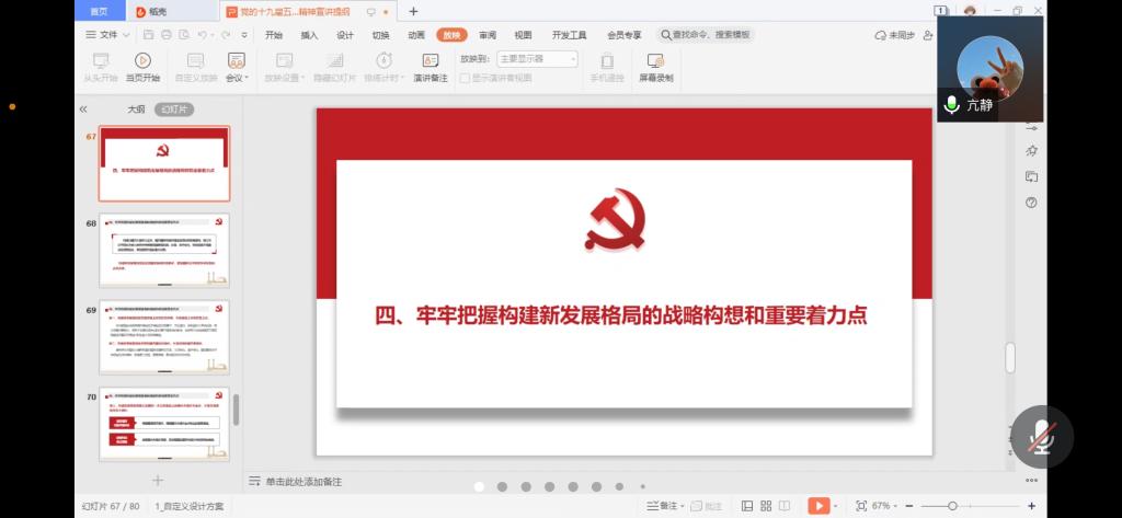 此次活动采取分组学习的模式,针对十九届五中全会精神展开深入学习。党支委提前将本支部同志分成五个小组,每个组对自己模块的内容进行消化吸收,选出一名同志代表本组为大家讲解此模块的内容,通过共享屏幕、打开麦克风的方式进行讲解,每位小组讲解时间5-10分钟。如果模块内容过多可选择重点难点讲解。