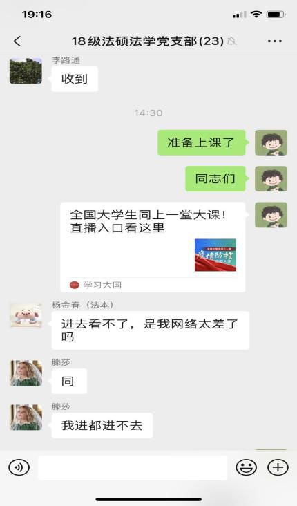 各党支部于2020年3月9日下午按时通过网络云端与全国大学生同上一堂疫情防控思政大课。此次课程中,几位教授分别从保护自然、坚持党的领导、保障人权、敢于承担责任等方面对此次疫情发表感想。课后,各党支部成员就所学所感进行了热烈的讨论。