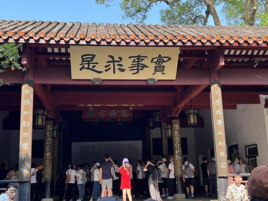 接下来,同学们依次参观了书院院落、孔庙、园林、屈子祠。岳麓书院讲堂屋檐下,高悬着的“实事求是”匾额给同学们留下了深刻印象。2020年,习近平总书记专程来到岳麓书院,提出了许多富有创见的新思想、新观点、新论断,强调岳麓书院党实事求是精神的发源地。实事求是不仅是我党的核心纲领,也是湖南大学这座千年学府的精神内核之一。作为湖大学子,同学们更应在学习生活中践行和发扬实事求是精神,以实际行动彰显实事求是精神的时代内涵。