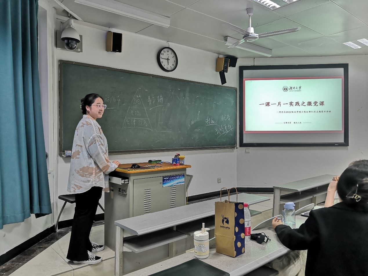本次党日活动由支部组织委员刘双主持开展。活动开始,首先由刘双介绍本次微党课活动的背景。为深入学习宣传贯彻党的二十大精神,严格党内政治生活、提高党的组织生活质量,着力解决“三会一课”形式化和党员领导干部执行双重组织生活不严格等问题,党组织决定开展“一课一片一实践”活动。并介绍此次领学党员同志郭懿文和刘昱涵的讲解主题。
