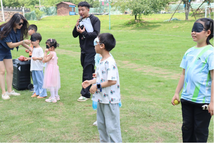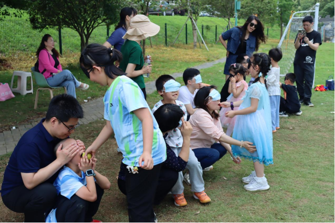 最后,我们进行了“蒙眼喂食物”游戏,参与游戏的家长与孩子都各自蒙上了眼睛,孩子站在家长的对面,听着家长的指挥将食物顺利喂进其嘴中。不仅锻炼了家长与孩子之间的默契,也让家长体验到了被孩子照顾的温馨的感觉。