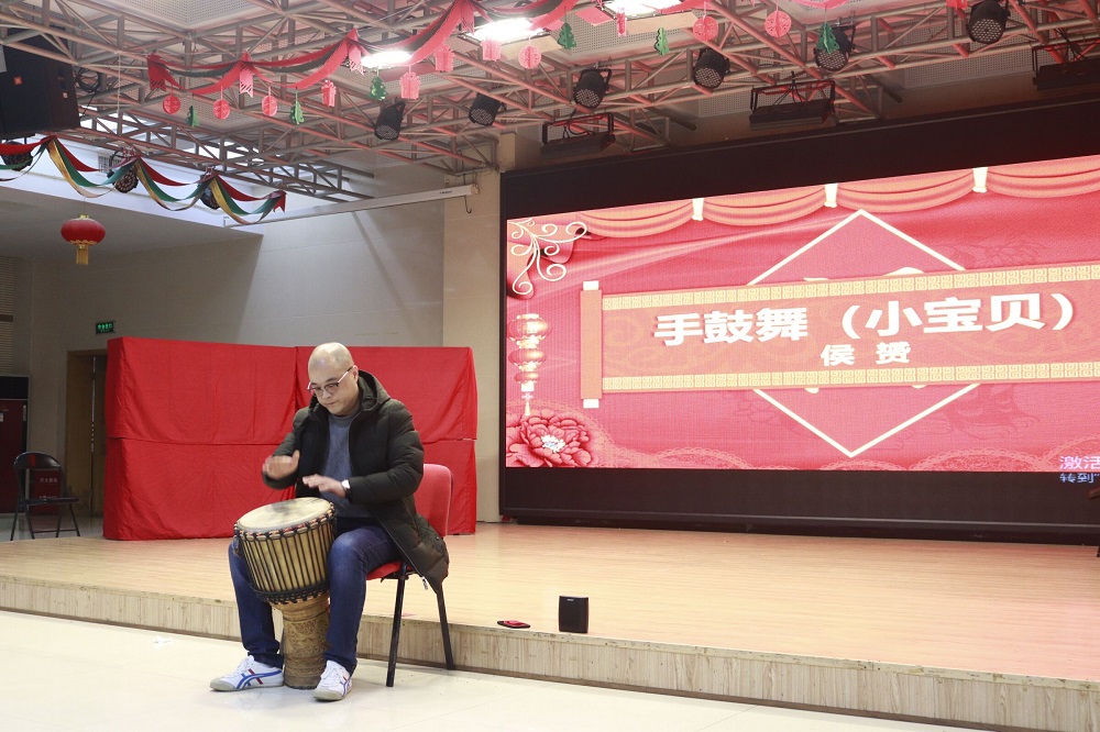 游戏环节后,侯赟老师为大家带来了精彩的手鼓表演《小宝贝》,一曲轻松欢快的《小宝贝》,搭配上手鼓或急促或舒缓、或清脆或雄浑的节奏打击,台上仅有的一人一鼓也让观众们的屏息凝听,一曲终了,全场掌声雷动。随后,在愈发欢快的气氛中,宋槿篱老师也在众人推选下走上舞台,深情演唱经典曲目《高原蓝》,尽管中途因设备问题受到一定影响,但宋槿篱老师嘹亮高亢的嗓音同样赢得了观众满堂喝彩。