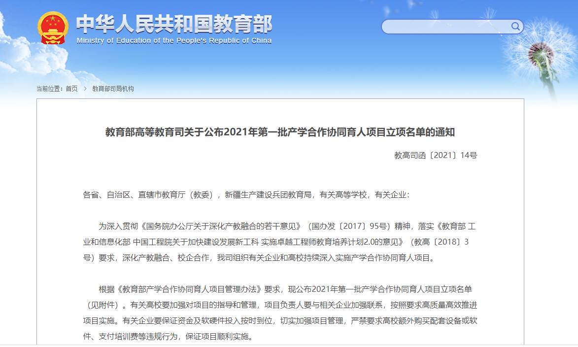 日前,教育部发布了《教育部高等教育司关于公布2021年第一批产学合作协同育人项目立项名单的通知》(教高司函〔2021〕14号),棋牌游戏官网