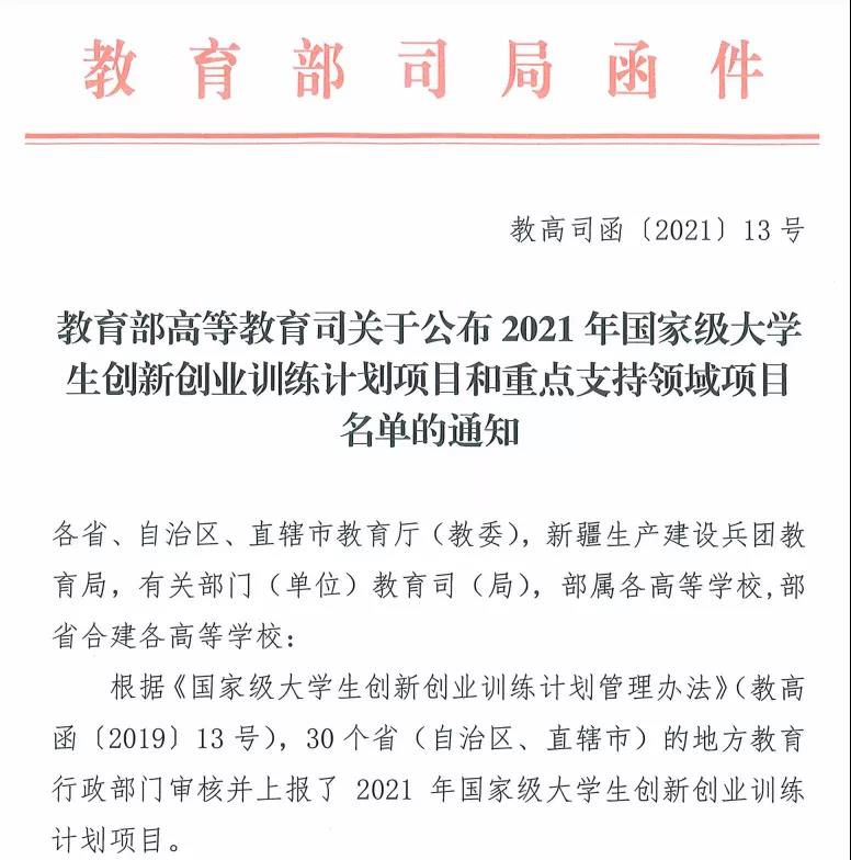 2021年8月24日,教育部高等教育司公布了2021年国家级大学生创新创业训练计划项目名单,棋牌游戏官网 本科生金博涵、曹炉丹主持申报的创新训练项目与朱雨欣主持申报的创业实践项目入选,项目分别由罗英、王文胜与蒋海松老师指导。本次项目入选,是棋牌游戏官网 学子学术创新创业能力的集中展示,也是棋牌游戏官网 注重本科生培养,坚持开展学术创新训练与创业教育的成果。