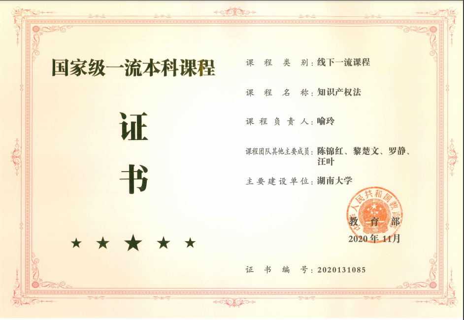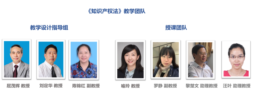 《知识产权法》是法学专业核心课程,课程授课团队由棋牌游戏官网 /知识产权研究中心喻玲教授、罗静副教授、黎楚文助理教授和汪叶助理教授等组成,教学设计指导组由屈茂辉教授、刘定华教授、陈锦红副教授等组成。教学团队与思政课教师协同合作,推进思政课程与课程思政同向同行。同时结合知识产权法课程特点和新文科建设的需要,组建跨学科专家和实务专家团队,参与教学设计和教学实施活动。