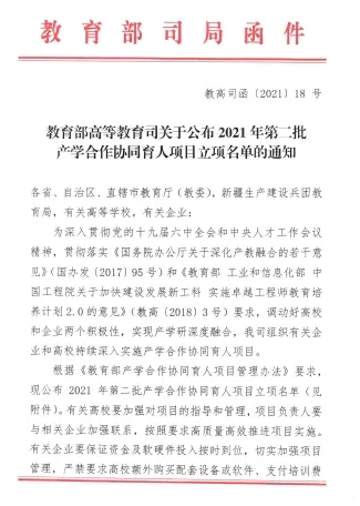 日前,教育部发布了《教育部高教司关于公布2021年第二批产学合作协同育人项目立项名单的通知》(教高司函[2021]18号),棋牌游戏官网