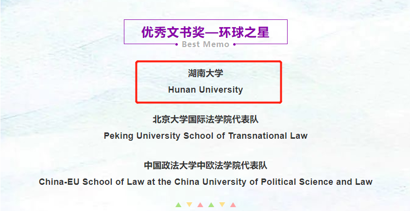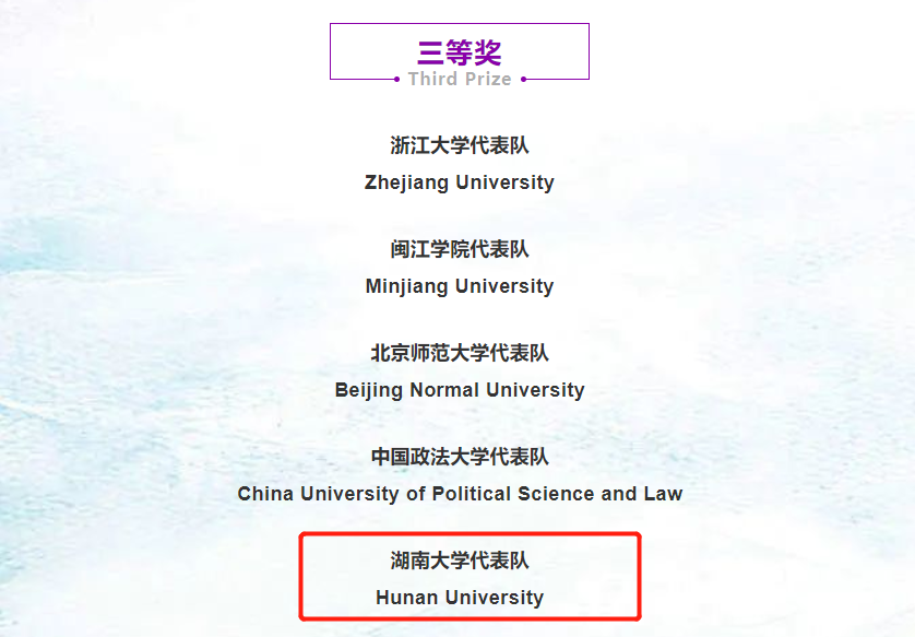 2021年11月29日至12月3日,第十九届“贸仲杯”国际商事模拟仲裁庭辩论赛暨Willem C. Vis国际商事仲裁模拟仲裁庭辩论赛国内赛以线上的形式举办,吸引了来自北京大学、清华大学、中国人民大学和湖南大学等七十多支队伍参赛。在此次赛事中,湖南大学代表队以卓越的表现荣获Best Memo(最佳文书奖,全国第一)以及Third Class Prize(三等奖)。与此同时,岳正圆同学荣获Best Oralist(最佳辩手);曲筝同学荣获Outstanding Contribution Award(团队突出贡献奖)。本次获奖是棋牌游戏官网 学科竞赛和本科生人才培养的又一可喜成果。