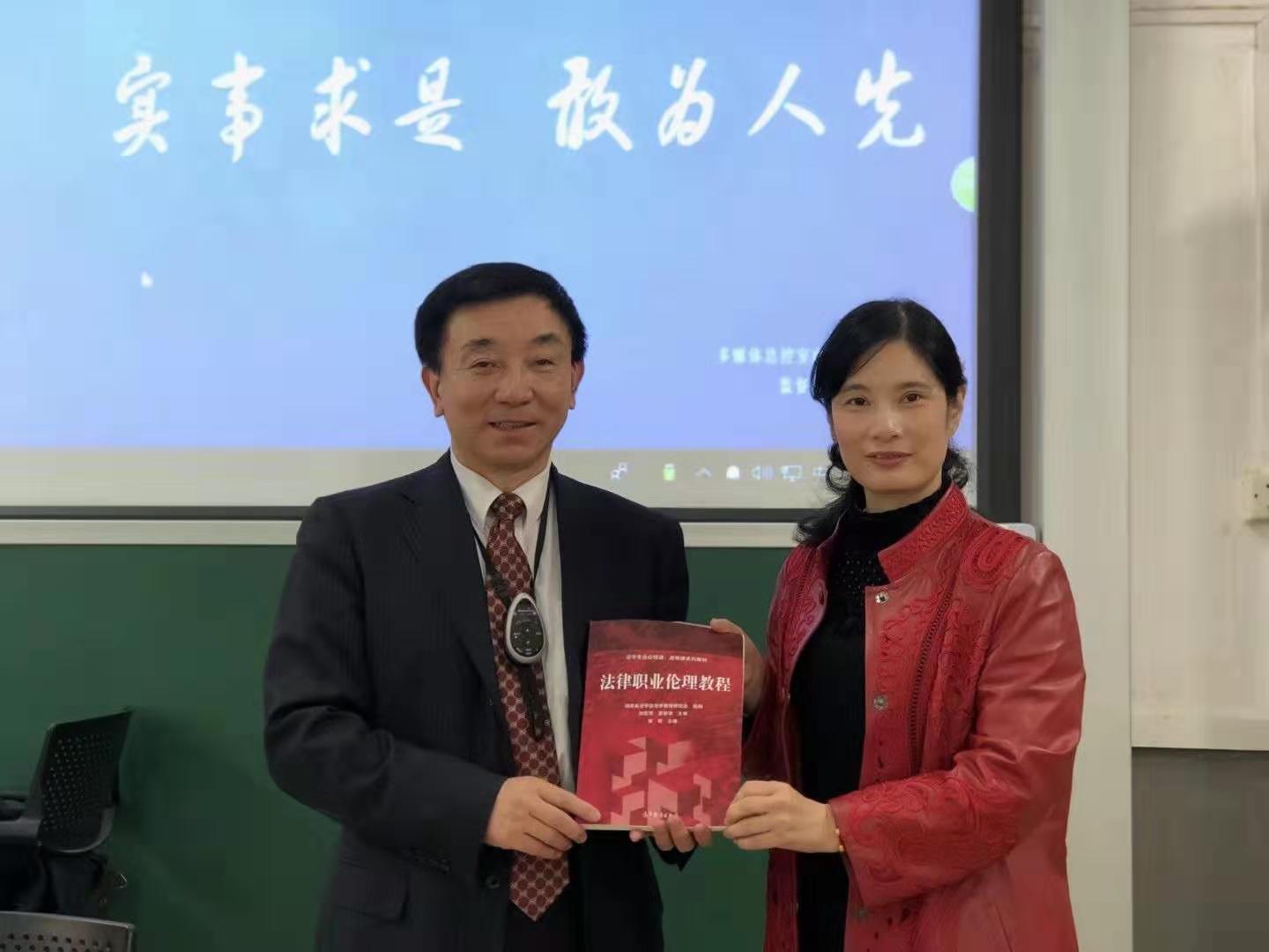 (图:课程邀请国家一级高级检察官、安徽省检察院原党组成员柴学友进课堂现身讲授《检察官职业伦理》,图为柴学友与课程负责人郭哲副教授合影)