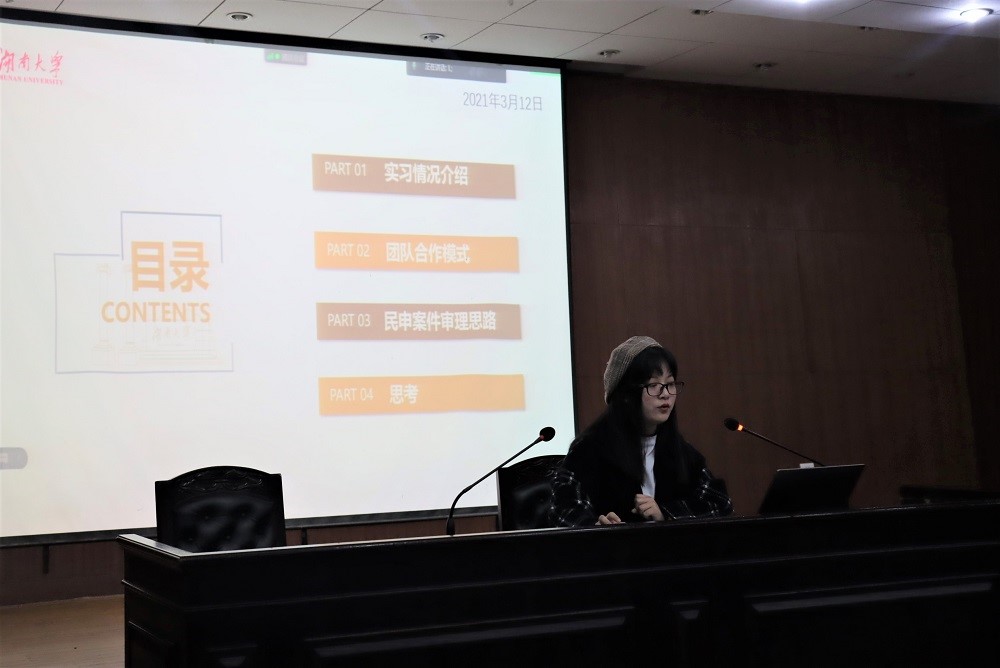 第四位分享实习经验的是唐智灵,她也从实习情况、团队合作模式、民申案件审理思路、实习感悟四个方面分享了自己实习以来的心得体会。唐智灵最后分享了她实习后的三个思考内容:注重思维差异,明确定位;重视案例,避免空想;注重基础理论与法律思维。
