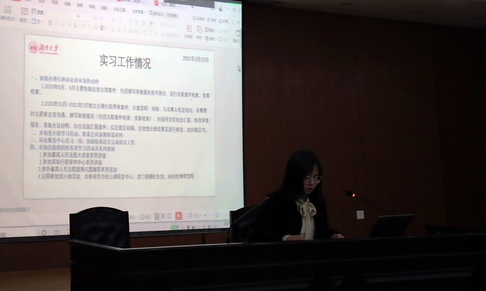 第三位分享实习经验的是简洁。她主要介绍了自己在一巡的两段经历:在行政审判团队的实习经历和在信访中心实习一周的经历。在行政审判团队实习,主要工作是撰写审查报告,在这一过程中有三个要点需要注意,分别是细心、归纳总结和案件检索。在信访中心的一周,简洁最大的体会是,作为一名法律人,必须严格区分客观事实和法律事实,法官有着天然强大的使命,为更好地帮助当事人理解裁判结果,法官必须在裁判文书中尽可能完整合理地论证,提高裁判文书的说服力。