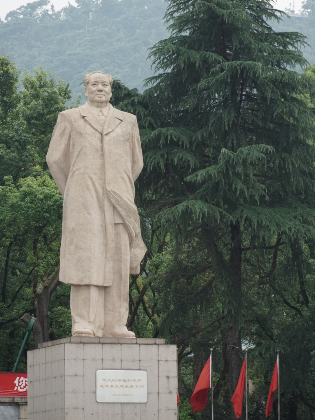 “东方红,太阳升”,沿着湘江中路转入牌楼路,一路直行,便可抵达湖南大学的东方红广场,毛主席雕像矗立在广场中央。他将双手背在后面,深情远眺着高高升起的东方日出,凝望着他熟悉的土地——这座雕像是湖南大学珍贵的地标性建筑,象征着历史的厚重和对未来的期许。