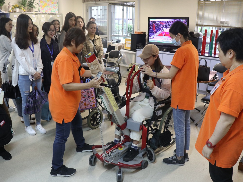 (同学们在中心复康服务区体验残障人士起离机)