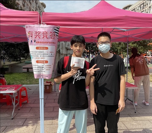 活动现场,有奖问答的气氛十分热烈。通过抽取题目并成功作答,参与活动的同学们既获得了精致的奖品,更增强了维权意识、丰富了法律知识。连续答对九道题目的同学可以获得法棋牌游戏官网