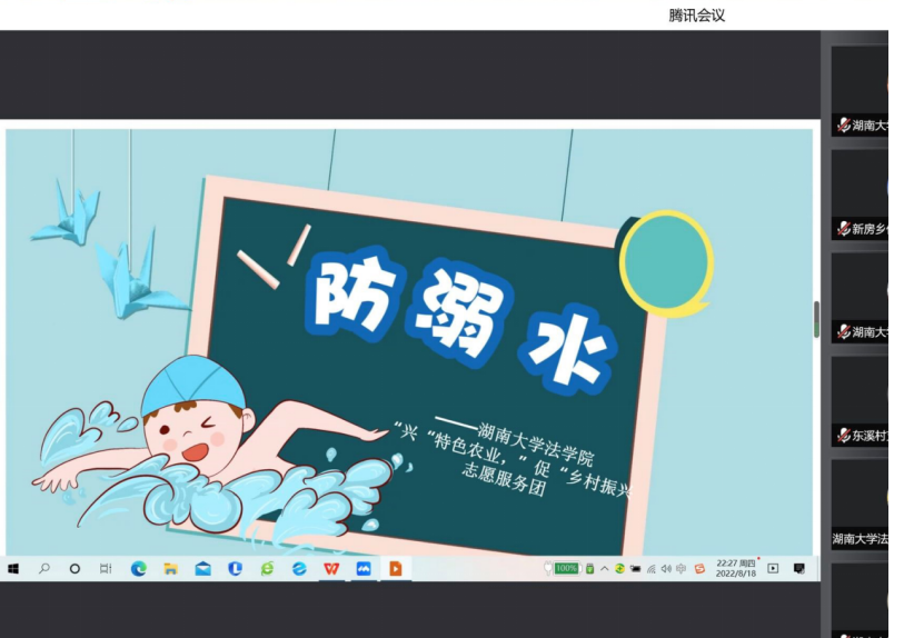 社会实践团队通过互联网会议平台召开线上宣传会,并组织乡村中许多青少年及其家长参会,向他们详细介绍危险水域的辨别、游泳注意事项、如何救援落水者以及落水后如何自救等内容。