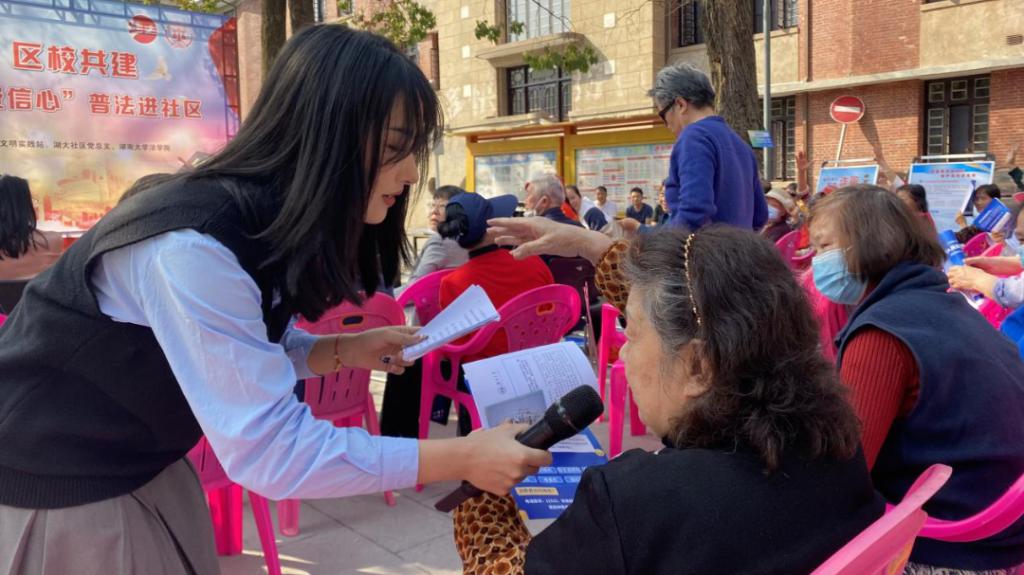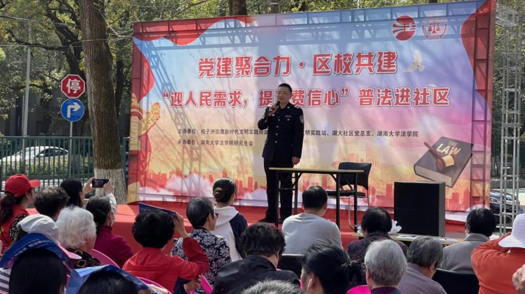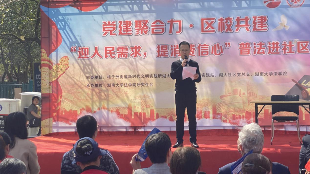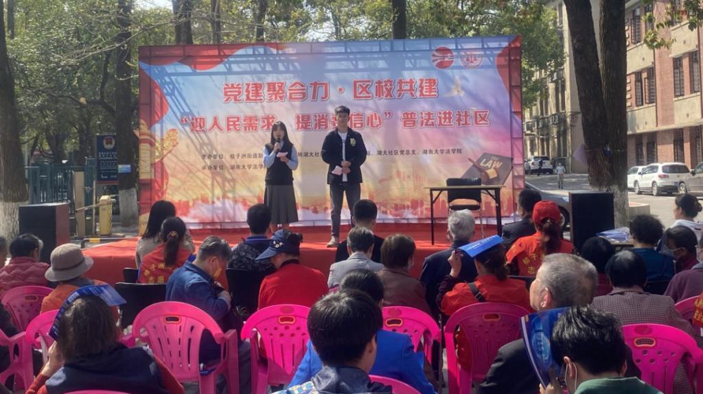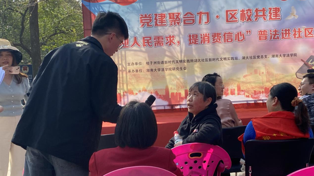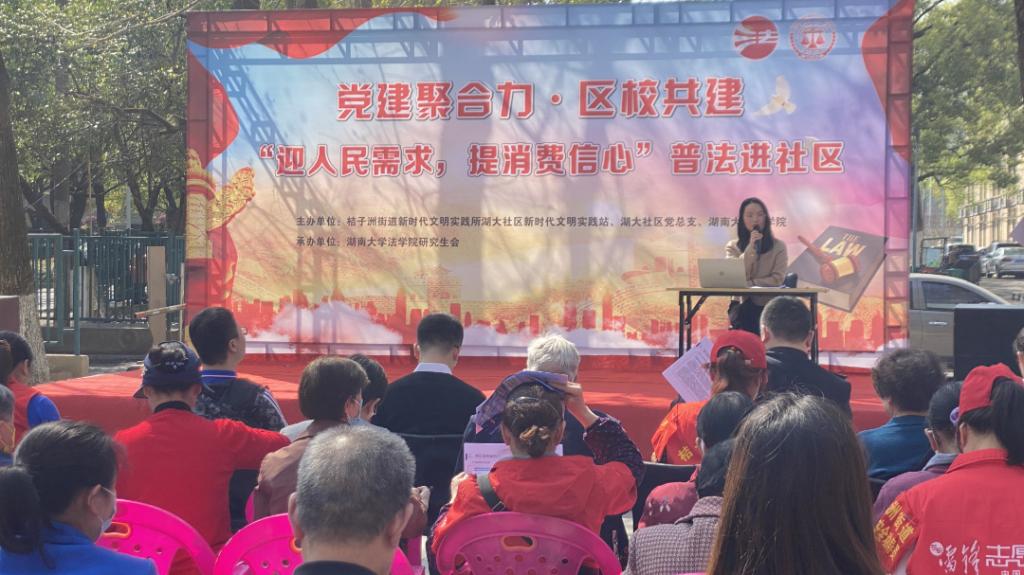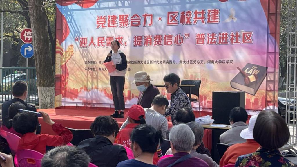 在湖南大学七舍前坪开展以“迎人民需求,提消费信心”为主题的普法进社区宣传活动。