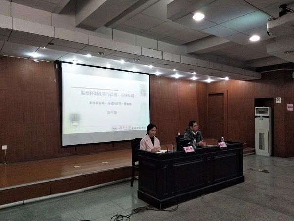 学术沙龙的第二个环节由袁柏顺教授主讲。袁教授首先针对博士生吴晓梦的论述发表了自己的看法,认为争议的实质是中央反腐败意志与现有法律规范的冲突。紧接着,袁教授结合新加坡与香港的反腐败模式,从两国对反腐败后果的认知与首要关切、反腐败的战略、途径与体制上分析了监察体制改革与高效、持续的反腐之间的关系,目的是要使监察成为一只有锋利牙齿的老虎。而后袁教授又对新加坡和香港的反腐败方式进行了比较,袁教授说道:“无论是新加坡还是香港的反腐败模式,都是别人家的孩子,既然是别人家的孩子,那肯定就有所不同,也不能照搬。”启示我国的监察体制改革要有所借鉴,但不能完全照搬。袁教授运用风趣幽默的语言,深刻严密的逻辑,激发了同学们新的思考,有的同学时而面露疑惑,时而埋头记录,纷纷等待着与老师共同探讨相关问题。