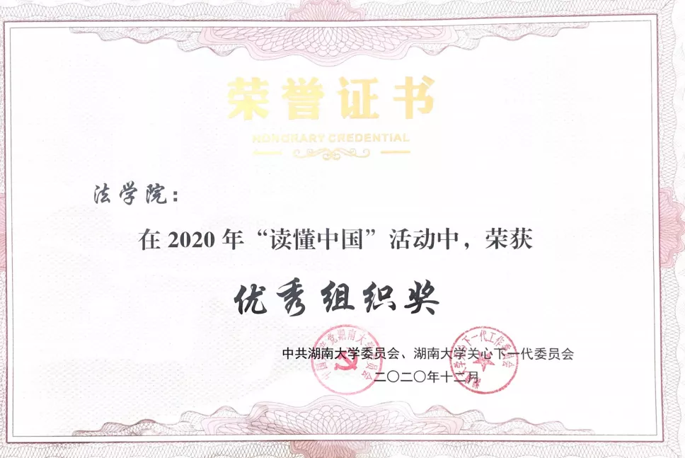 获评优秀组织奖,多位2018级本科生获不同级别奖项。1805班陈宇阳征文作品《拥法治强国梦想 踏复兴之路前行》获教育厅三等奖及湖南大学一等奖,1803班楚玉祥征文作品《春风化雨,润物无声》获湖南大学二等奖,1802班刘海源征文作品《蜡炬成灰,所以为师》、1802班邢书源征文作品《麓山之下》、1802班许芷晴征文作品《岁老根弥壮,阳娇叶更阴》均获湖南大学三等奖。
