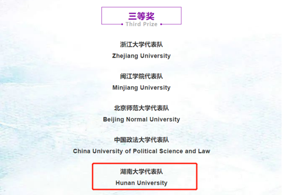 2021年,在第十九届“贸仲杯”国际商事模拟仲裁庭辩论赛中,湖南大学代表队以卓越的表现荣获Best Memo(最佳书状奖—环球之星,全国第一)以及庭辩Third Class Prize(三等奖)。2022年,在第二十届“贸仲杯”国际商事仲裁模拟仲裁庭辩论赛中,棋牌游戏官网