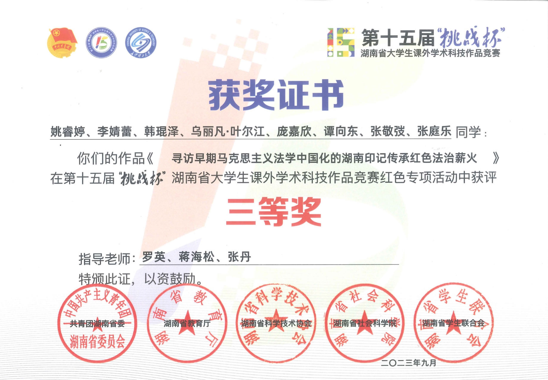 2023年,棋牌游戏官网 “红色法韵传习团”项目《寻访早期马克思主义法学中国化的湖南印记 传承红色法治薪火》荣获第十五届“挑战杯”湖南省大学生课外学术科技作品竞赛红色专项三等奖,之前还斩获湖南大棋牌游戏官网 赛一等奖,取得了又一重要突破。项目还获得了“第二届湖南苏区法制论坛”一等奖并获邀做主题报告。